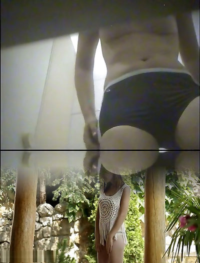 eine dame in der pool-umkleidekabine wird nackt und zeigt ihre bh-stuffers